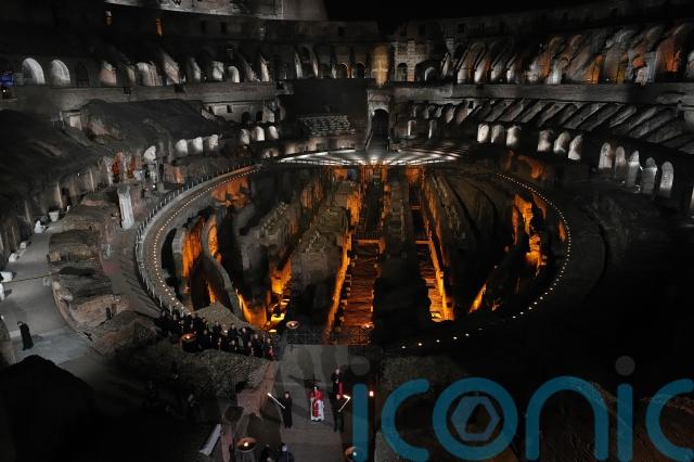The procession ends outside the Colosseum atop the Palatine Hill.