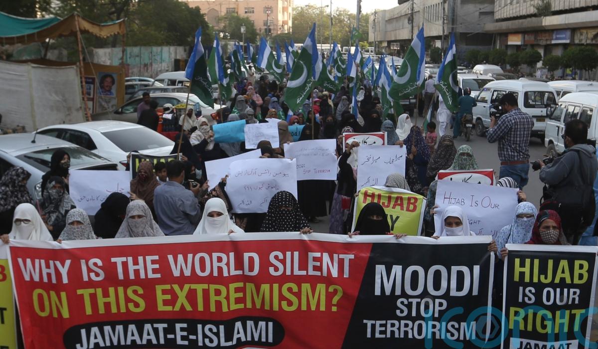 About a hundred women took to the streets in the southern port city of Karachi in a protest organised by a Pakistani Islamist political party, the Jamaat-e-Islami.