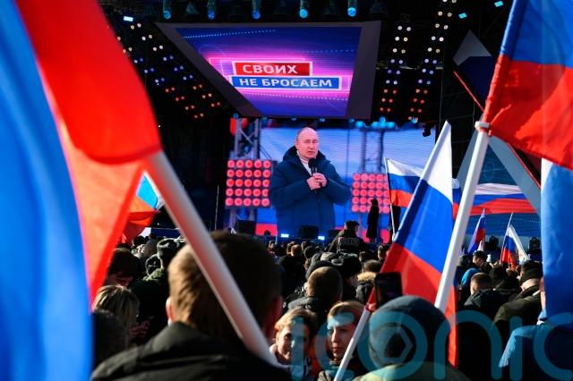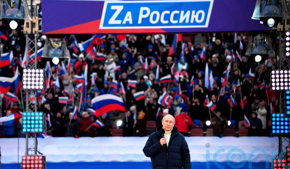 Russian President Vladimir Putin appeared at a huge, flag-waving rally at a Moscow stadium and praised his country’s troops in biblical terms on Friday as they pressed their lethal attacks on Ukrainian cities with shelling and missiles.