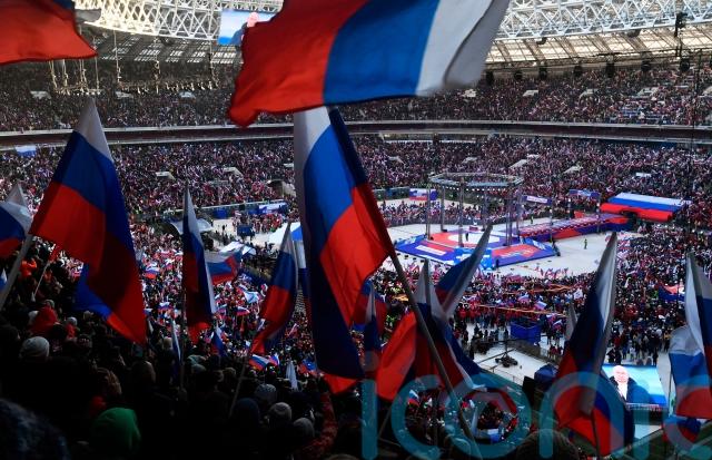 Moscow police said more than 200,000 people were in and around the Luzhniki stadium for the celebration marking the eighth anniversary of Russia’s annexation of the Crimean peninsula, seized from Ukraine.