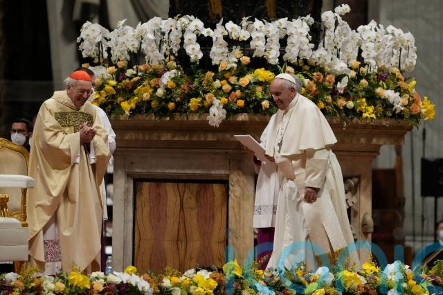 Francis, who has been suffering from an inflamed ligament, did not participate in a candle-lit procession up the aisle of the darkened basilica at the start of the Mass.