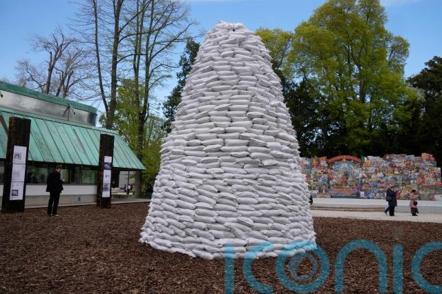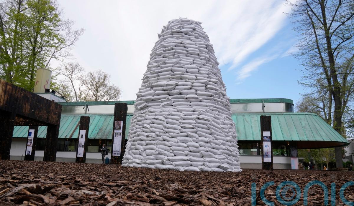 In the Giardini, the Ukrainian pavilion curators – German, Lanko and Borys Filonenko – have created a Ukrainian Piazza around a mound of sandbags, surrounded by posters made during the war by Ukrainian artists.