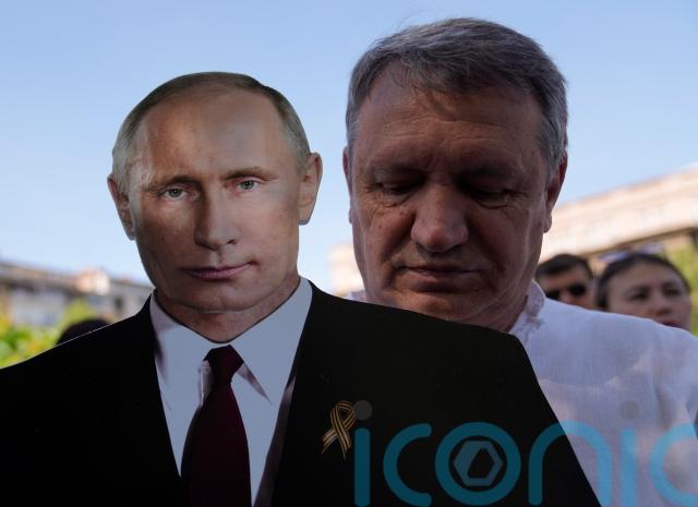 The banners echoed Mr Putin’s argument for launching the attack that since February 24 has killed thousands, displaced millions and inflicted widespread devastation on Ukrainian towns, cities and villages.