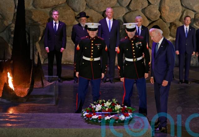 Mr Biden, wearing a skull cap, was invited to rekindle the eternal flame in the memorial’s Hall of Remembrance. Two Marines placed a wreath on the stone crypt containing the ashes of Holocaust victims and Mr Biden listened as a cantor recited the remembrance prayer.