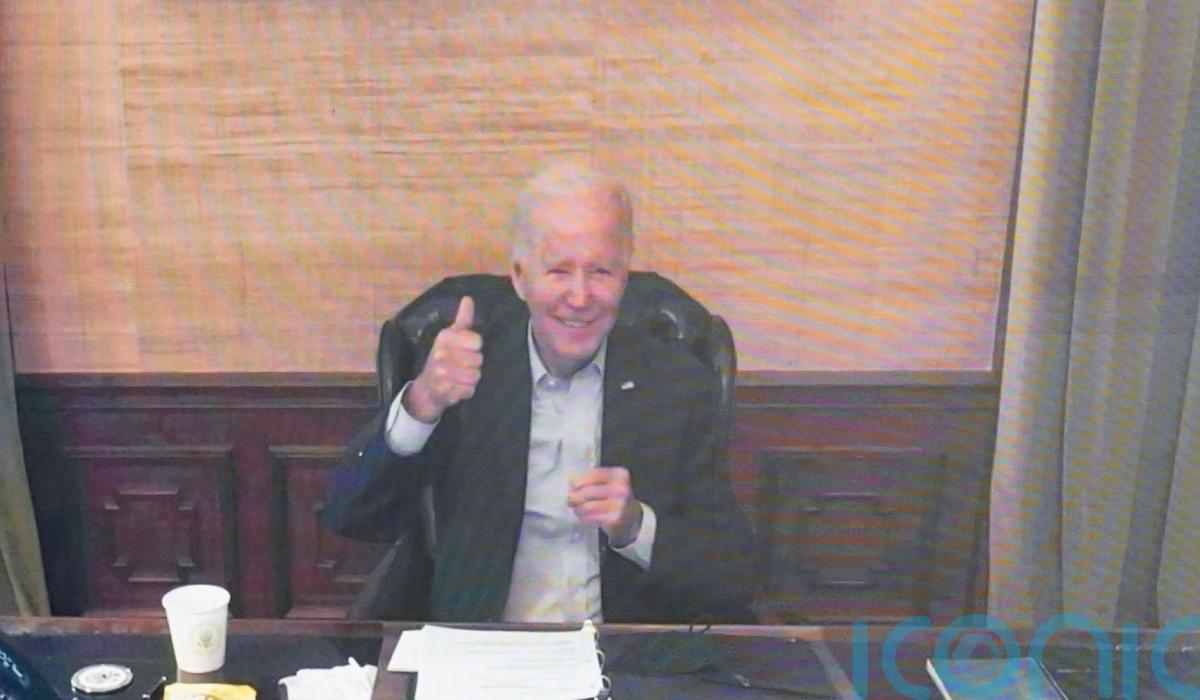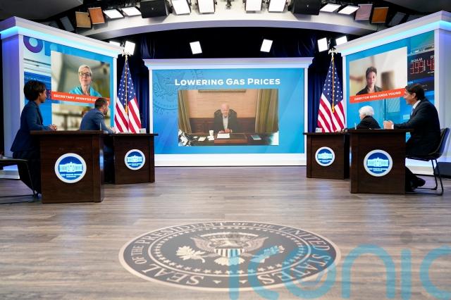 As he beamed into a virtual meeting from the Treaty Room, Mr Biden took off a mask and sipped water as he began discussing the decline in petrol prices in recent weeks.