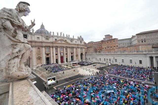 Seated under a canopy outside St Peter’s Basilica, Francis led the ceremony, which was punctuated by booms of thunder, flashes of lightning and pouring rain, prompting cardinals, bishops, the choir and thousands of rank-and-file faithful in the square to open umbrellas.