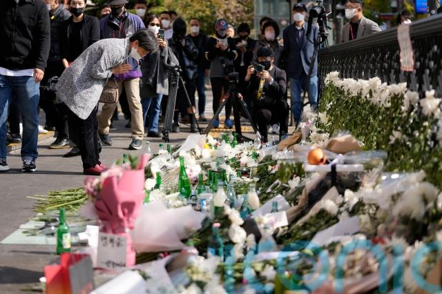 Many people also laid chrysanthemums, bottles of Korean “soju” liquor, candles and snacks near an Itaewon subway station and posted a host of condolence messages.