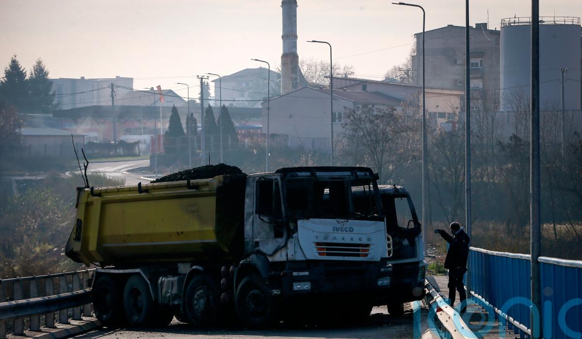 Two trucks were set on fire at a roadblock in the northern town of Mitrovica, Kosovo police said.