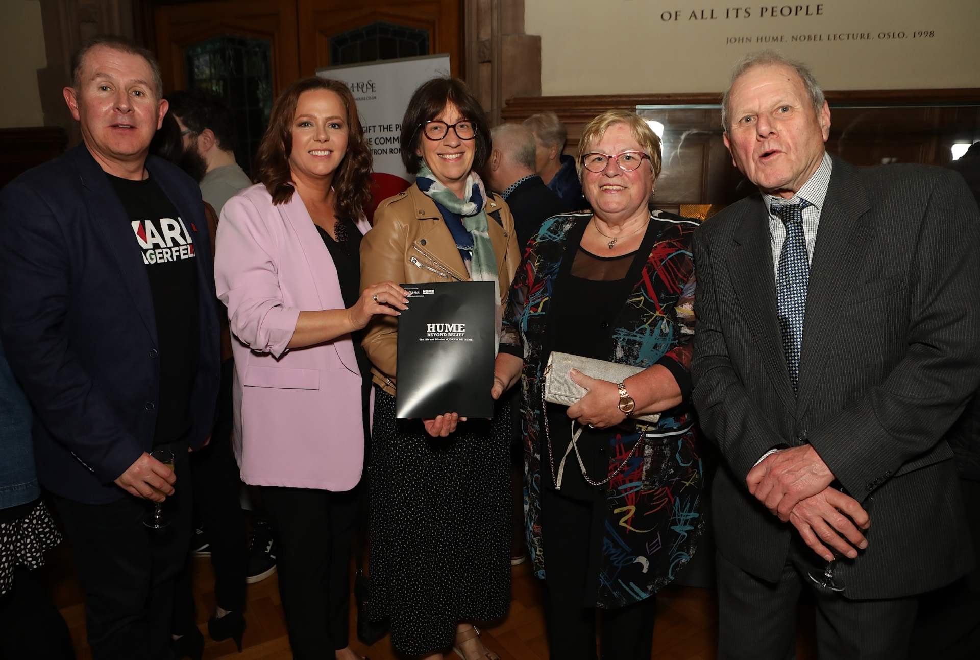Group pictured at the "Hume - Beyond Belief" musical play about the Life and Mission of John and Pat Hume. From left, are Paul Sweeney, Sharon Doherty, Joan Gallagher, manager, Derry Credit Union, Helene McManus, president at Irish League of Credit Unions, and Eamon Sharkey.