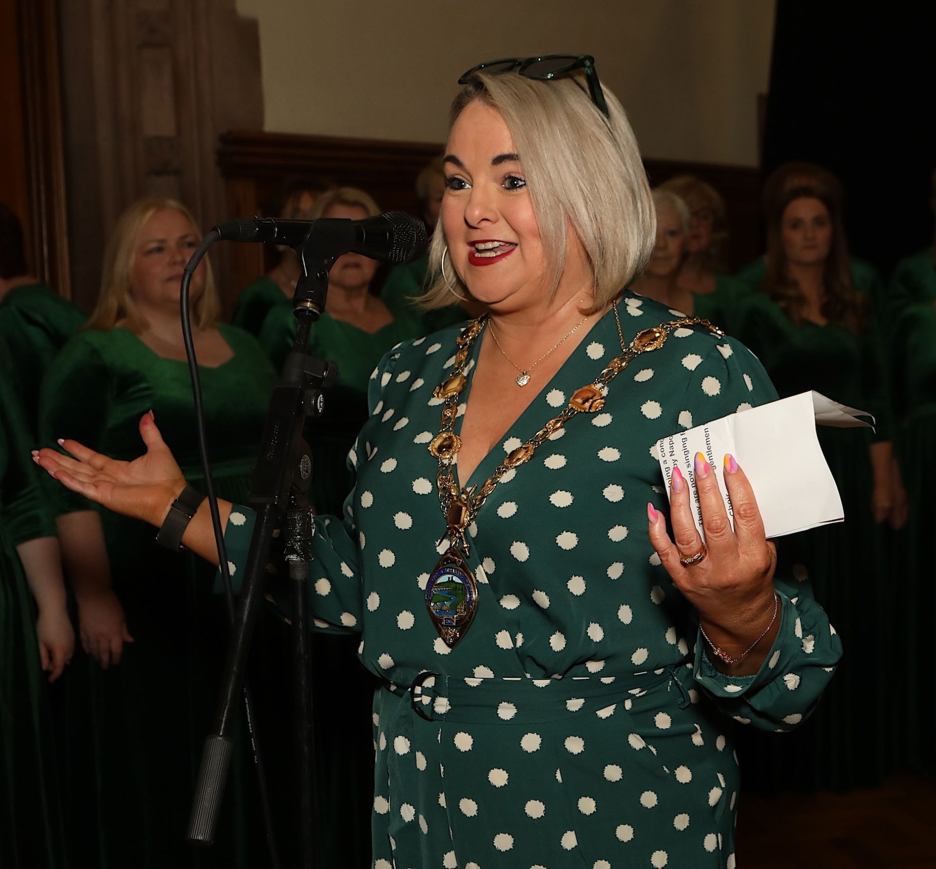 Mayor Sandra Duffy who officially welcomed everyone to the "Hume - Beyond Belief" musical play about the Life and Mission of John and Pat Hume held in the Guildhall.