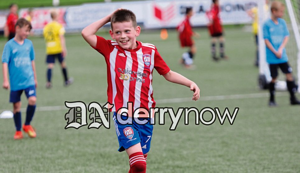 Core Soccer Academy's U8s Harry Devenney celebrates his goal against Portstewart Sea Hawks.