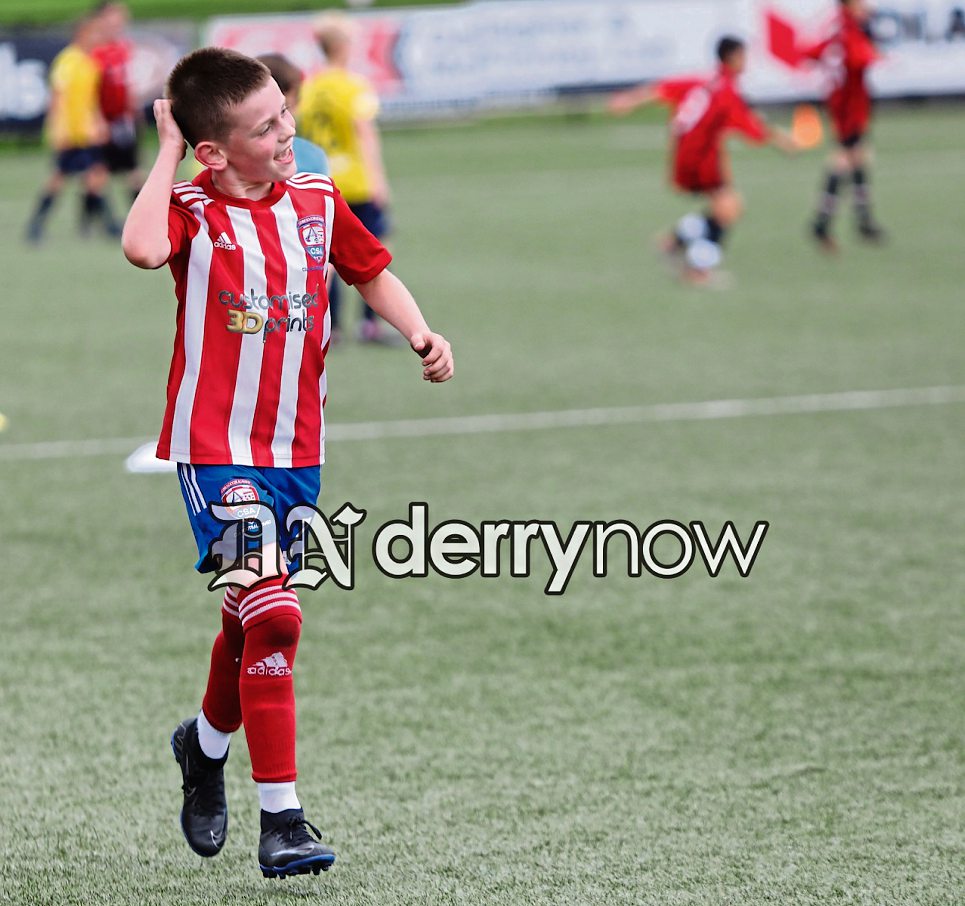 Core Soccer Academy's U8s Harry Devenney celebrates his goal against Portstewart Sea Hawks.