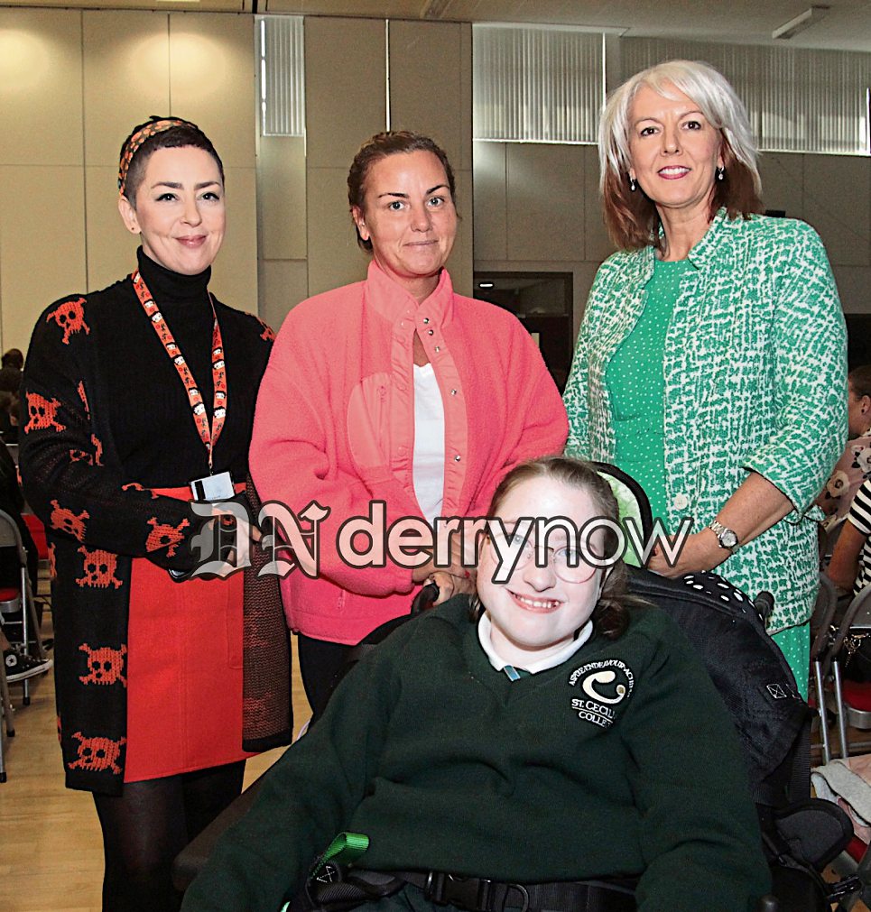 Ms O'Carolan, Principal St. Cecilia's College pictured pupil Seanain McCallion at the Year 8 Mass. Included also are Seanain's mum Kathleen and her assistant Deborah.