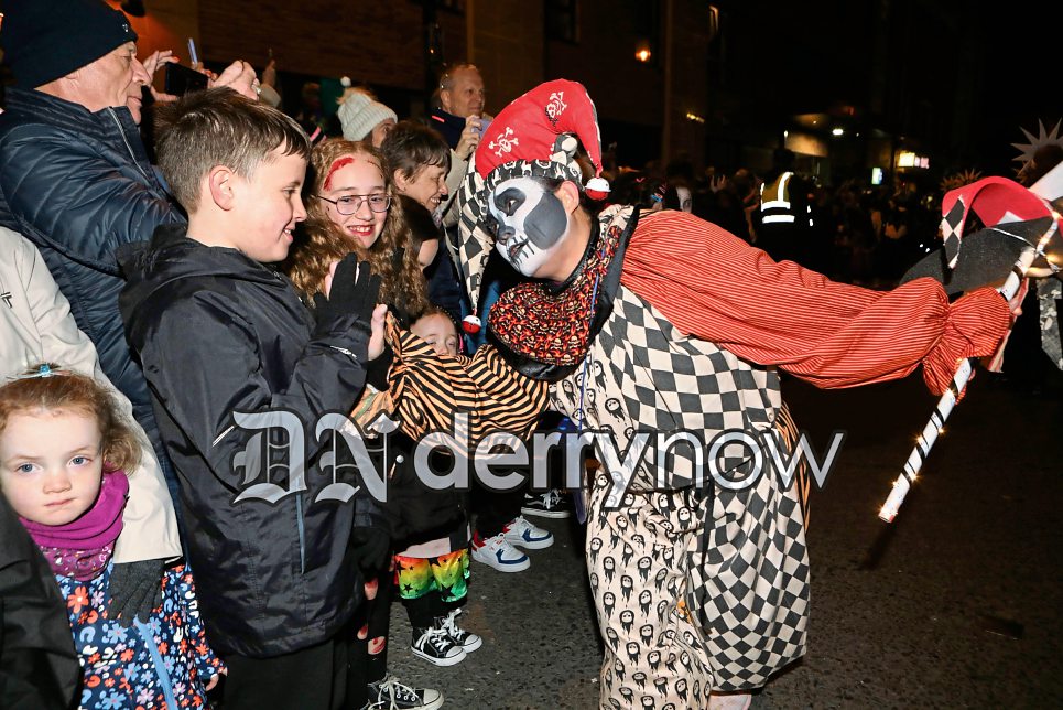 One of the jesters from the parade high 5 this young boy.