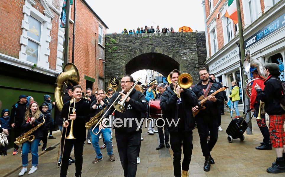 The showers certainly didn’t dampen the celebrations in Derry’s City Centre yesterday as the DLD Second Line Parade got underway, hot on the heels of the city’s Rock the Boat World Record success. The brass band leads the annual DLD Second Line Jazz Parade through Castle Gate. (Photo - Tom Heaney, nwpresspics)
