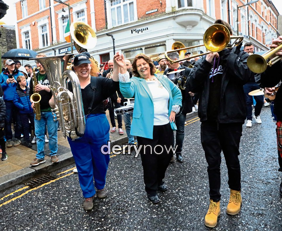 Mayor Patricia Logue "dancing in the street" at the annual DLD Second Line Jazz Parade. (Photo - Tom Heaney, nwpresspics)
