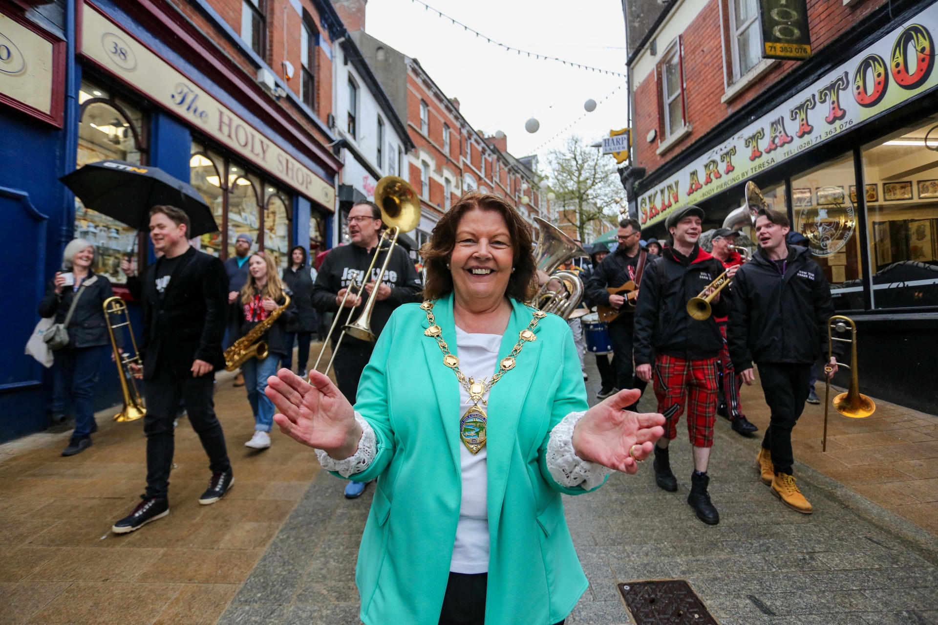 Mayor of Derry City and Strabane District Council, Councillor Patricia Logue, leads the DLD Second Line Parade along Waterloo Street. (Photo: Lorcan Doherty)