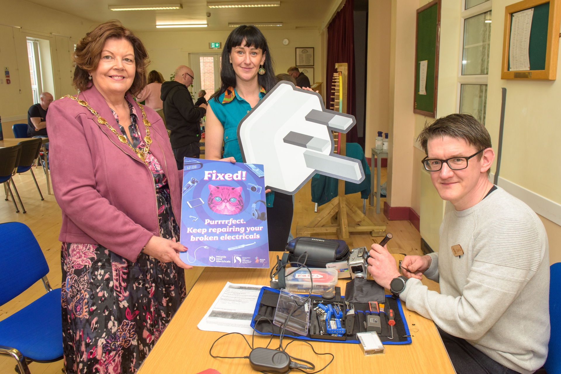 Mayor Councillor Patricia Logue pictured alongside Caroline McGuinness Brooks from Repair and Share and Davide Toone who brought a video camera back to working order. (Photos: Martin McKeown)