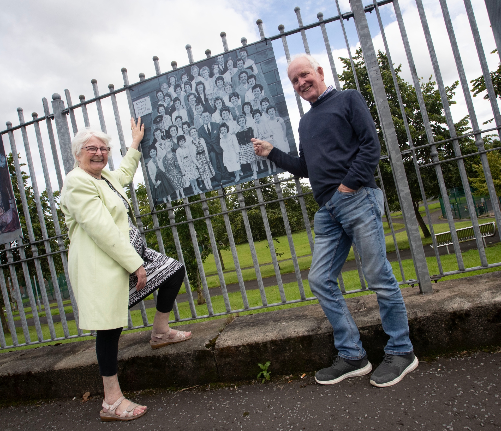 Creggan artist Celine Taylor gets high praise from her husband Dessie as she stands proudly beside her 'Factory Girls' artwork during Monday's Creggan Artists Exhibition launch at Bull Park.