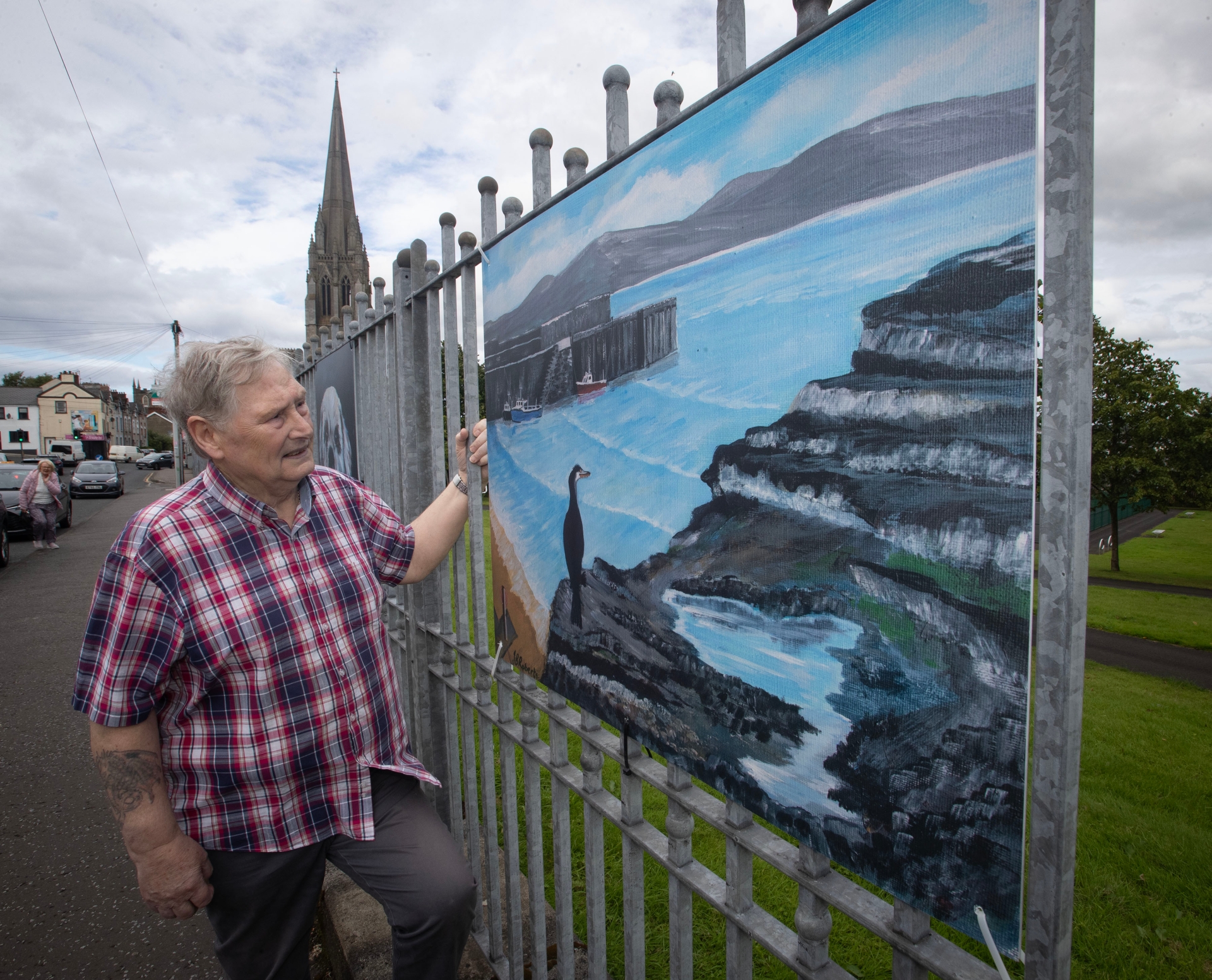 Creggan artist Jimmy Roberts admires his artwork at Monday's Creggan Artists Exhibition launch at Bull Park.