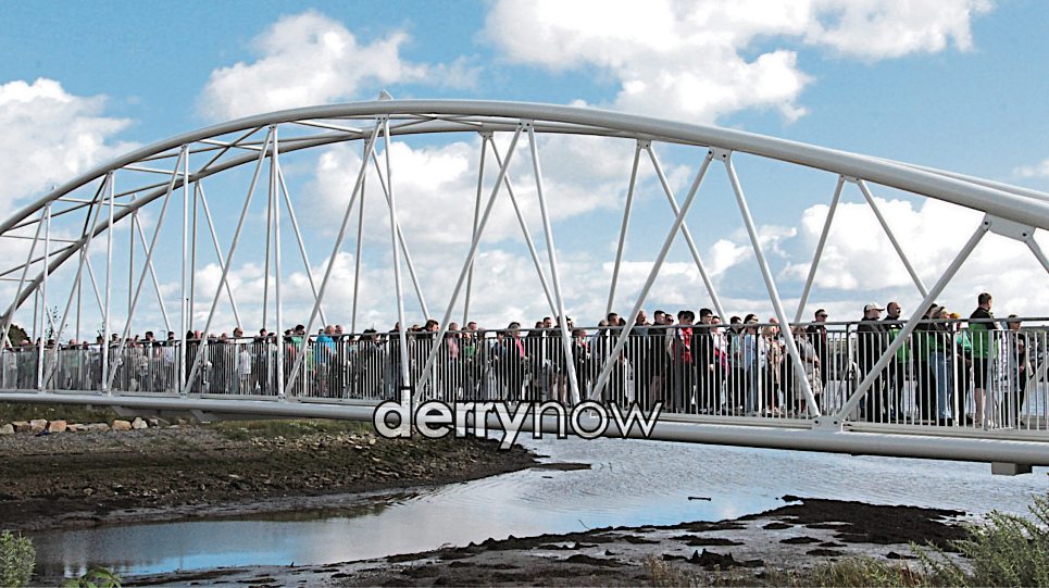 The McGuinness Family leading the way over The Pennyburn Bridge.