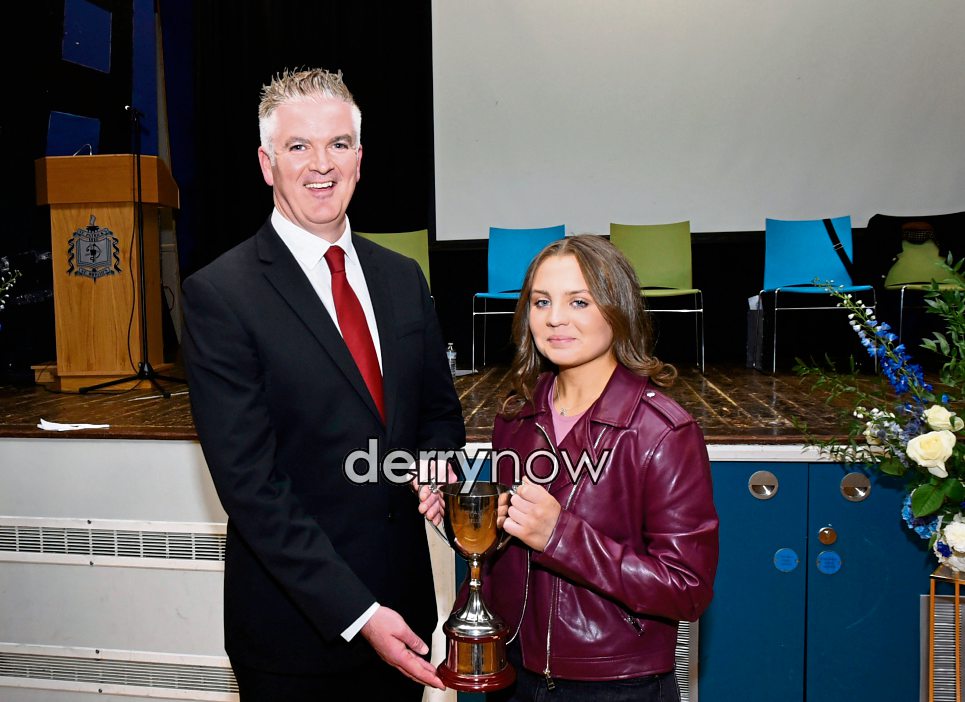 St Patrick's and St Brigid's College Principal Philip McCullagh presents the Principal's Cup for Academic Excellence to Cait McCloskey. (Photos - Kerrie Quinn, nwpresspics)