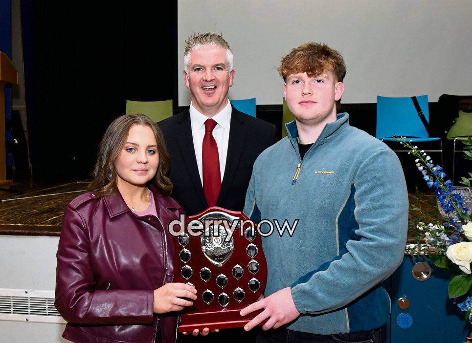 St Patrick's and St Brigid's College Principal Philip McCullagh presents the Head Boy and Head Girl Shield to Cait McCloskey and Rory Madden