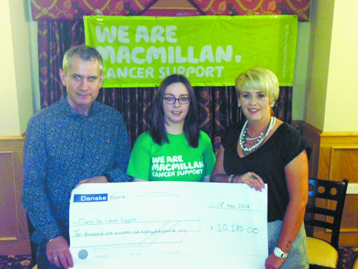 Mervyn McAleese and Claudia McAleese make the presentation to a representative from Macmillan.