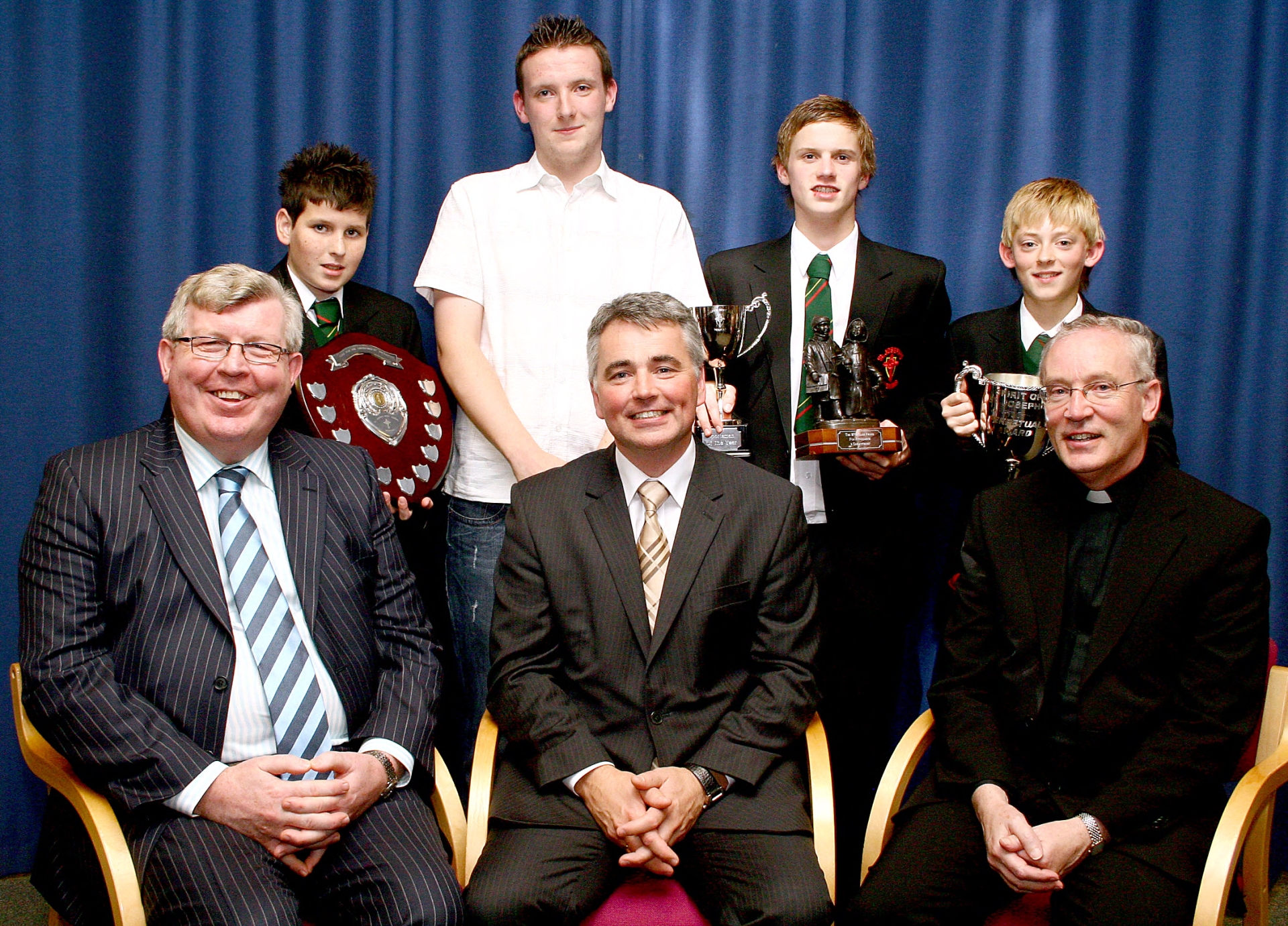 St. Joseph's Boy's pictured at their annual prize giving night. Front from left are Mr. E. Gallagher, Mr. D. Harkin and Fr. D. O'Kane. Back from left are Conor McFeeley, Environment Award, Garvan Kerr, Service To School, Eamon Colhoun, McMillan Award and Jack Dunlop, Spirit of St. Joseph's.