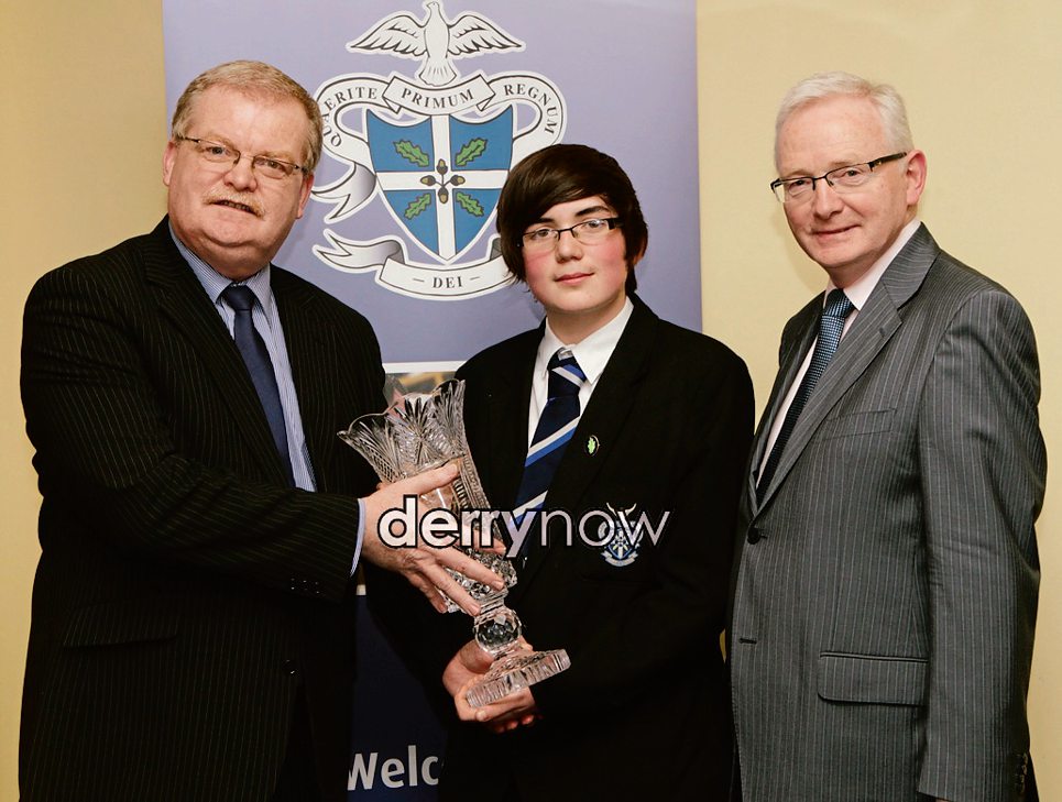 Sean Grant, chairman, Parents' Association, presents the Parents' Association prize for Public Speaking to Niall O'Kane. Included is Sean McGinty, principal. (Photos: Tom Heaney, nwpresspics)