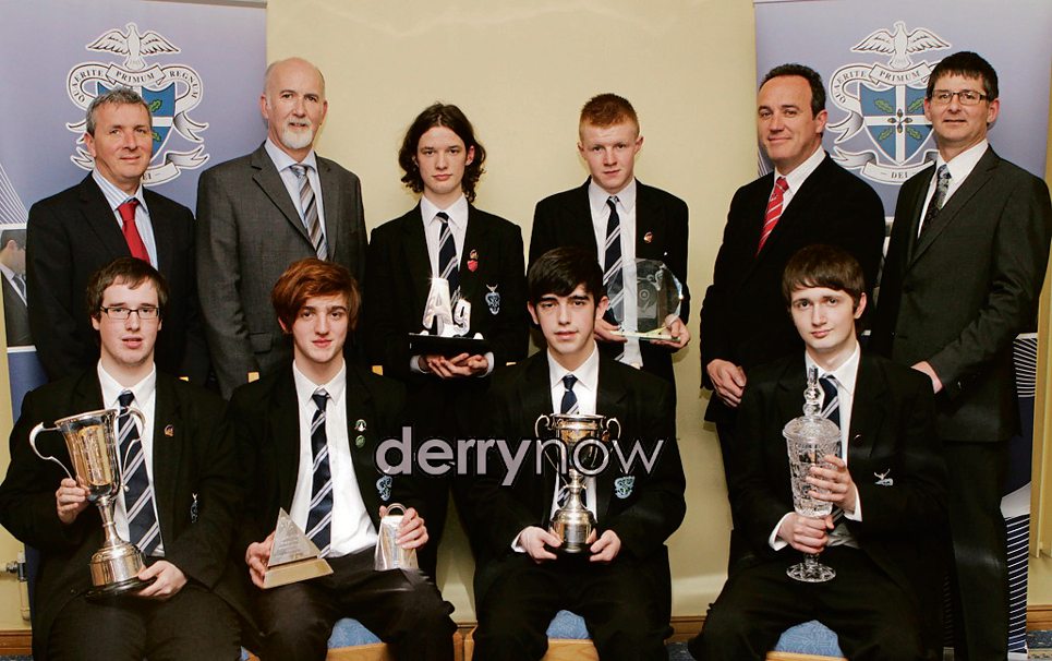 Seated, from left, are Ciaran McCormick (Lawrence Duffy Award for mathematics), Peter Wallace (Professor Philip G. Gormley prize for further mathemathics), Stephen Furey (biology prize), and Jonathan Hume (Bank of Ireland Award for physics). Standing, from left, are Rory McLaughlin, Board of Governors, Aidan Lagan, Head of Biology, Jack Tompson (chemistry prize), Aaron Crawley (The Applied Science prize), Noel Finn, Head of Chemistry, and Brian Keys, Head of Mathematics.