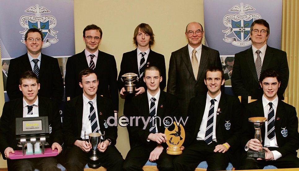 Seated, from left, are Patrick McCourt (Design and Technology prize), Ryan Morrison (construction prize), Martin Carlin and Caoimhan McCartney (Art & Design prize, joint), and Joseph McClelland (Moving Images Arts). Standing, from left, are John Johnston, senior teacher Sixth Form, Brendan McGinn, Head of Music, Shaun O'Hagan (Redmond Friel prize for music), Malachy McGonagle, Board of Governors, and Martin Meenan, Head of Moving Image Arts.