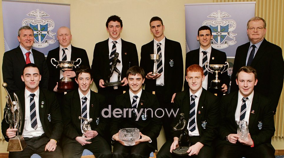 Seated from left, are Karl Bradley (Tony Furey Award for sporting excellence), Connor Gallagher (Walsh family prize for sport and physical education), Daniel Wray (Derry City FC prize for soccer), Cahir Mullan (Brendan DolanAward for Gaelic football), and Matthew McCourt (basketball prize). Standing, from left, are Rory McLaughlin, Board of Governors), Christopher Kelly (Eugene O'Hare chess prize), Conor McGoran (Na Magha Award for sport), Conor Cregan (Regan Award for athletics), Adam Barr (Tom Dunbar Award for commitment), and Sean Grant, chairman, St. Columb's College Parents Association.