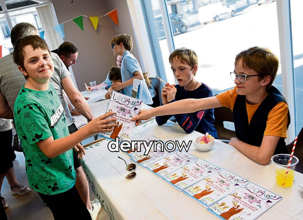 Lewis picking up a copy of Jamie and Christy O'Kane's book (Photos - Kerrie Quinn, nwpresspics)