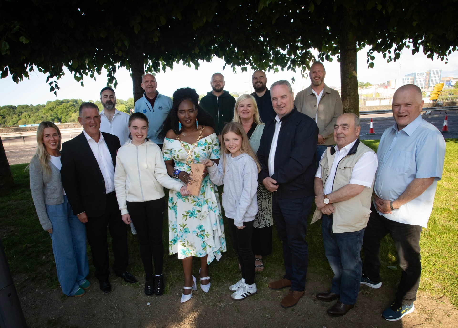 GROVE CELEBRATE 45 YEARS. . . .The Mayor, Lilian Seenoi-Barr pictured making a special presentation outside the Guildhall on Monday afternoon to the Grove Theatre Group who celebrated 45 years of productions this year. (Photos: Jim McCafferty Photography)