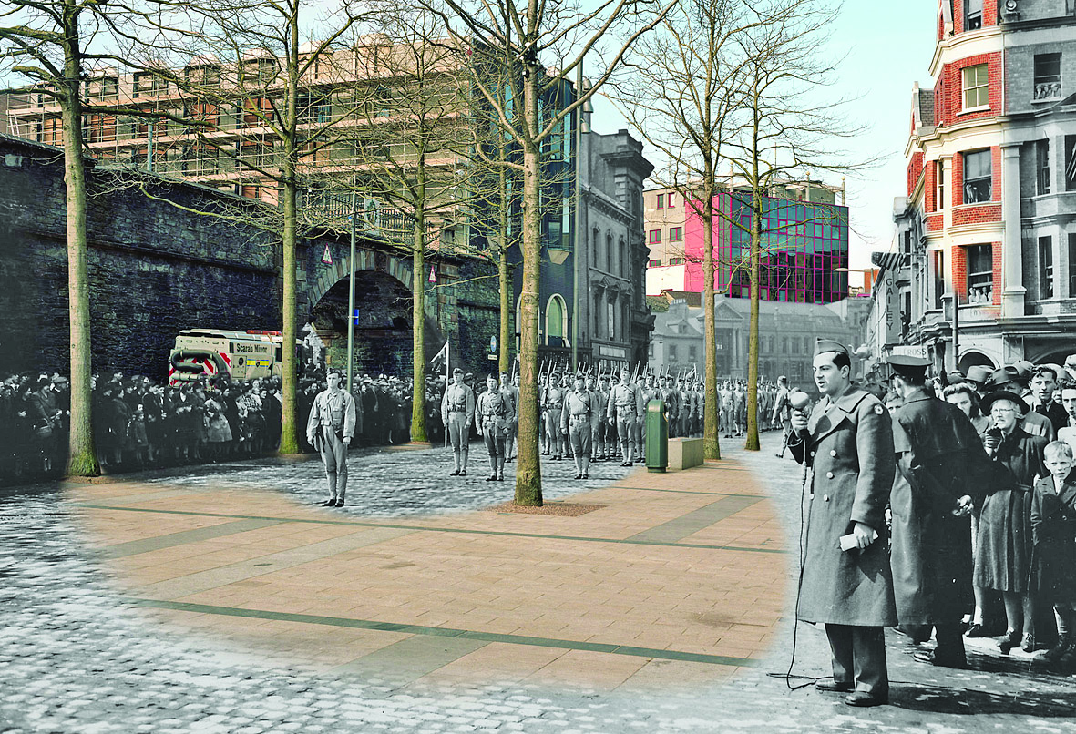 Soldiers pictured in the Guildhall Square 100 years ago, with the present-day buildings in the foreground.