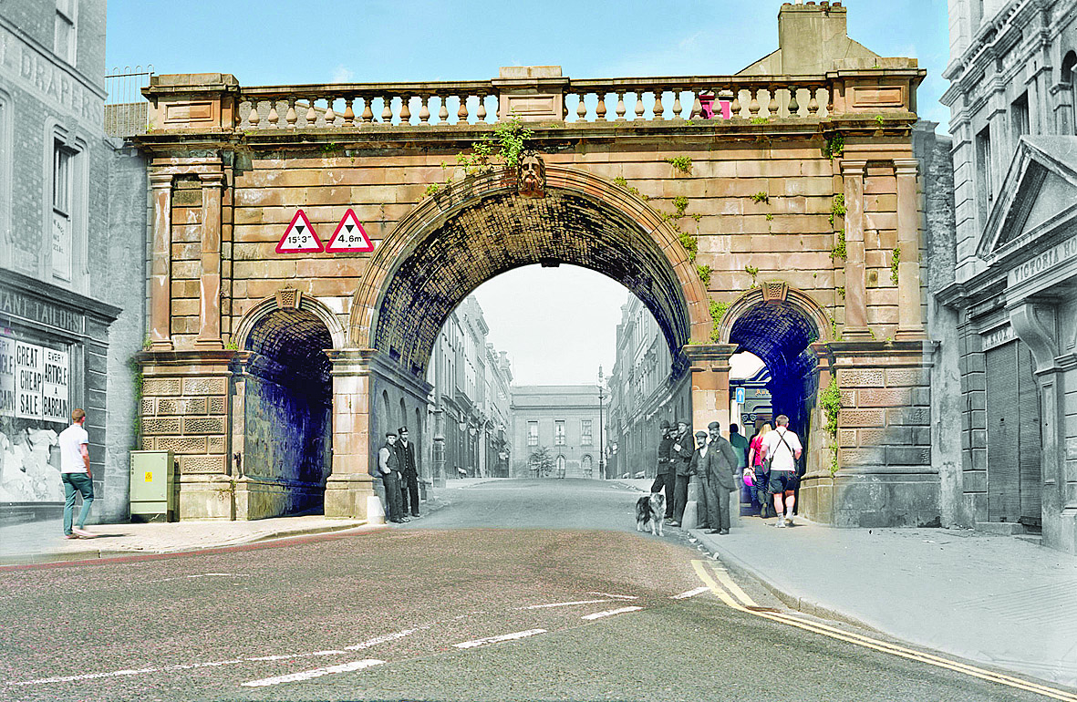 Ferryquay Gate with the former Town Hall in the background.