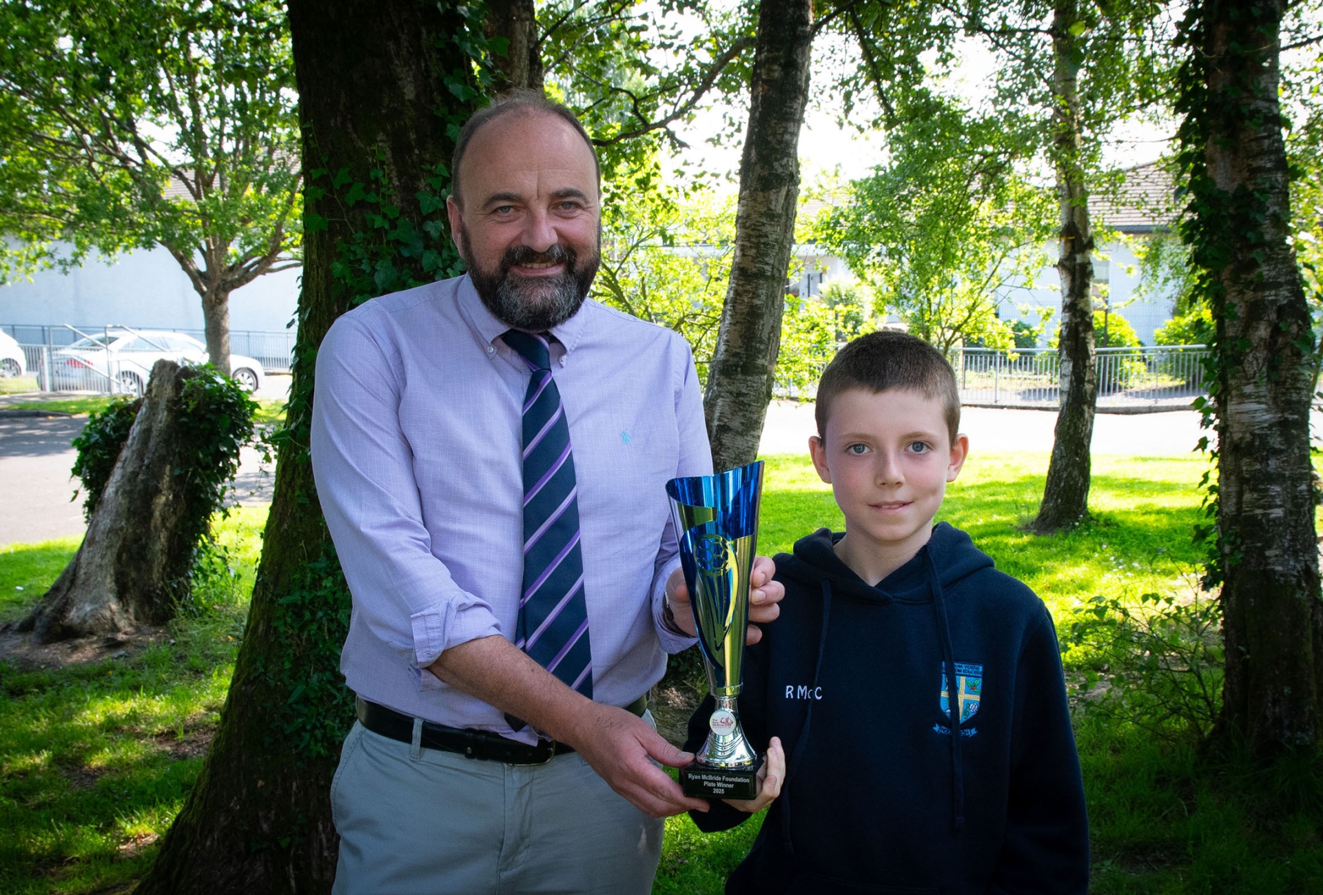 Mr. Feargal Friel, Principal pictured with Riley McCartney, captain of Hollybush PS, winners of the Ryan McBride Cup this year.