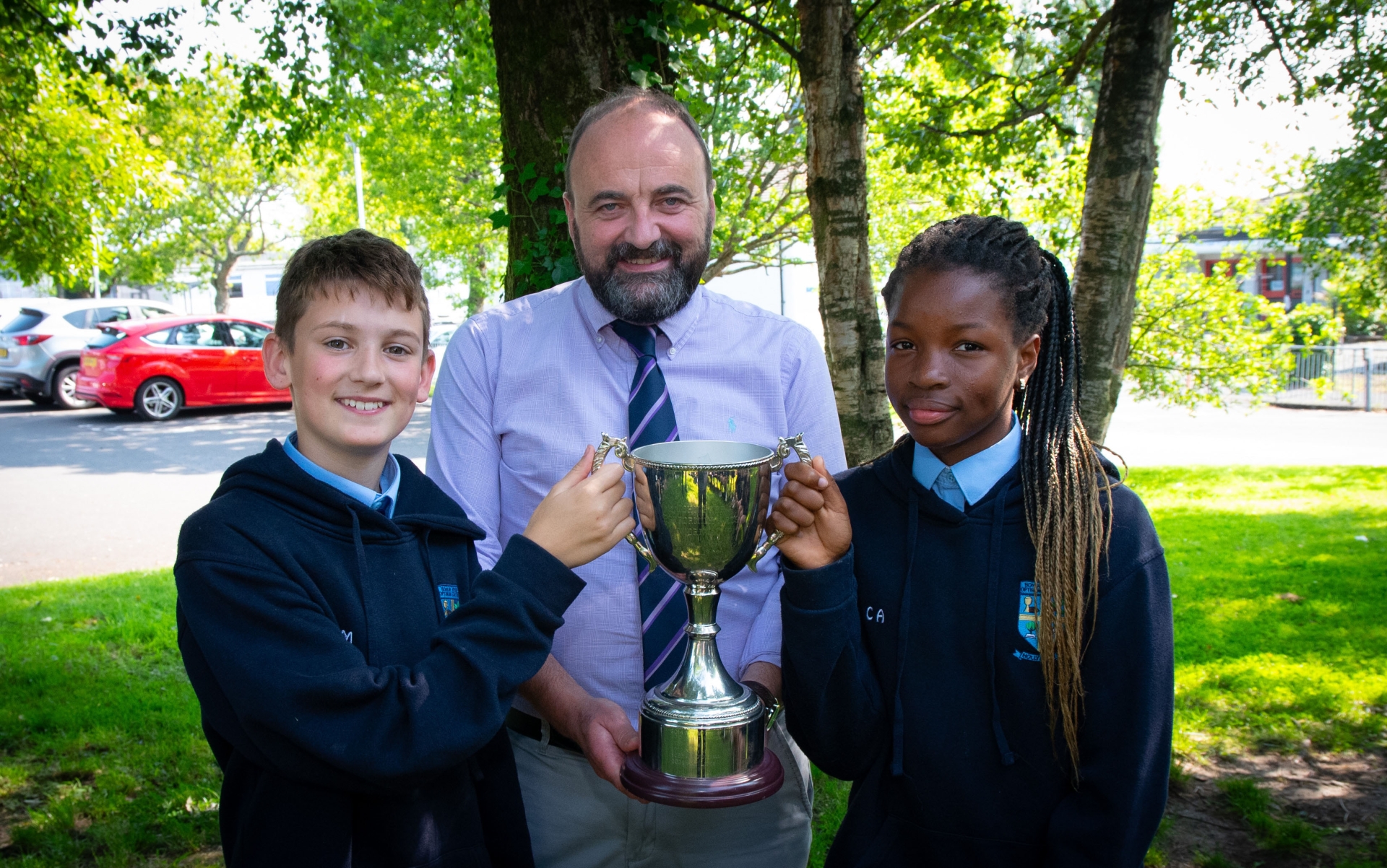 Cillian Molloy and Chloe Akwetey receiving the John Parr Cup for Performing Arts from Mr. Friel on Thursday.