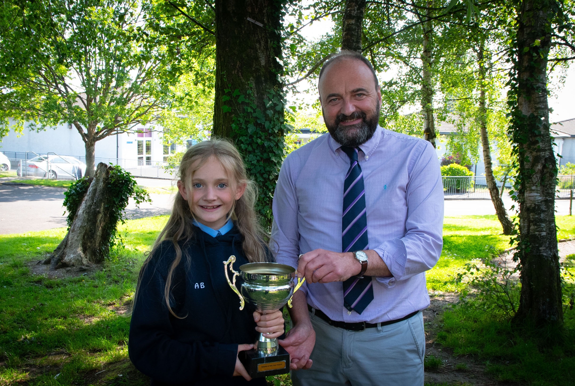 Mr. Feargal Friel presenting Annabelle Barr with the Athletics Award at Thursday's prizegiving in Hollybush PS.
