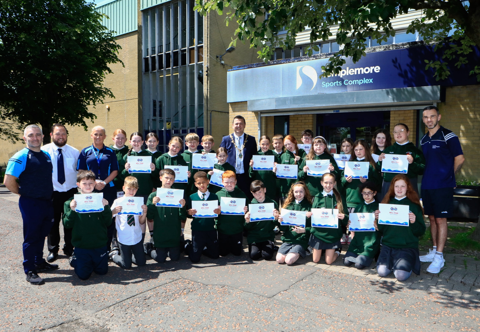 Mayor Ruairí McHugh who presented certificates to Greenhaw PS P7 pupils on completion of the Drowning Prevention Week programme held in Templemore Sports Complex. Included on right Alex Wilson, manager, and from left, Stephen Duffy, instructor, Christopher Martin, teacher and Michelle Sheerin, manager, and on right, Stephen Duffy, instructor.