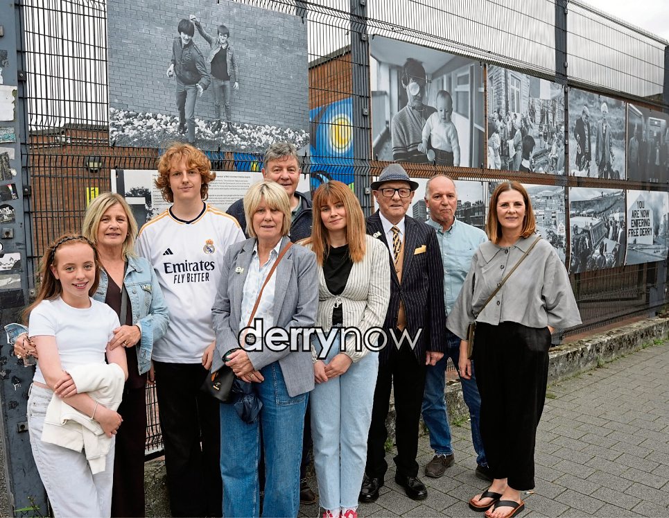 Michael English, father of Óglach Charles English, with family members at the exhibition of photos on display outside Pilot's Row before the screening of a short film about his son "A Bogside Freedom Fighter" in the Museum of Free Derry as part of the Féile 2025.