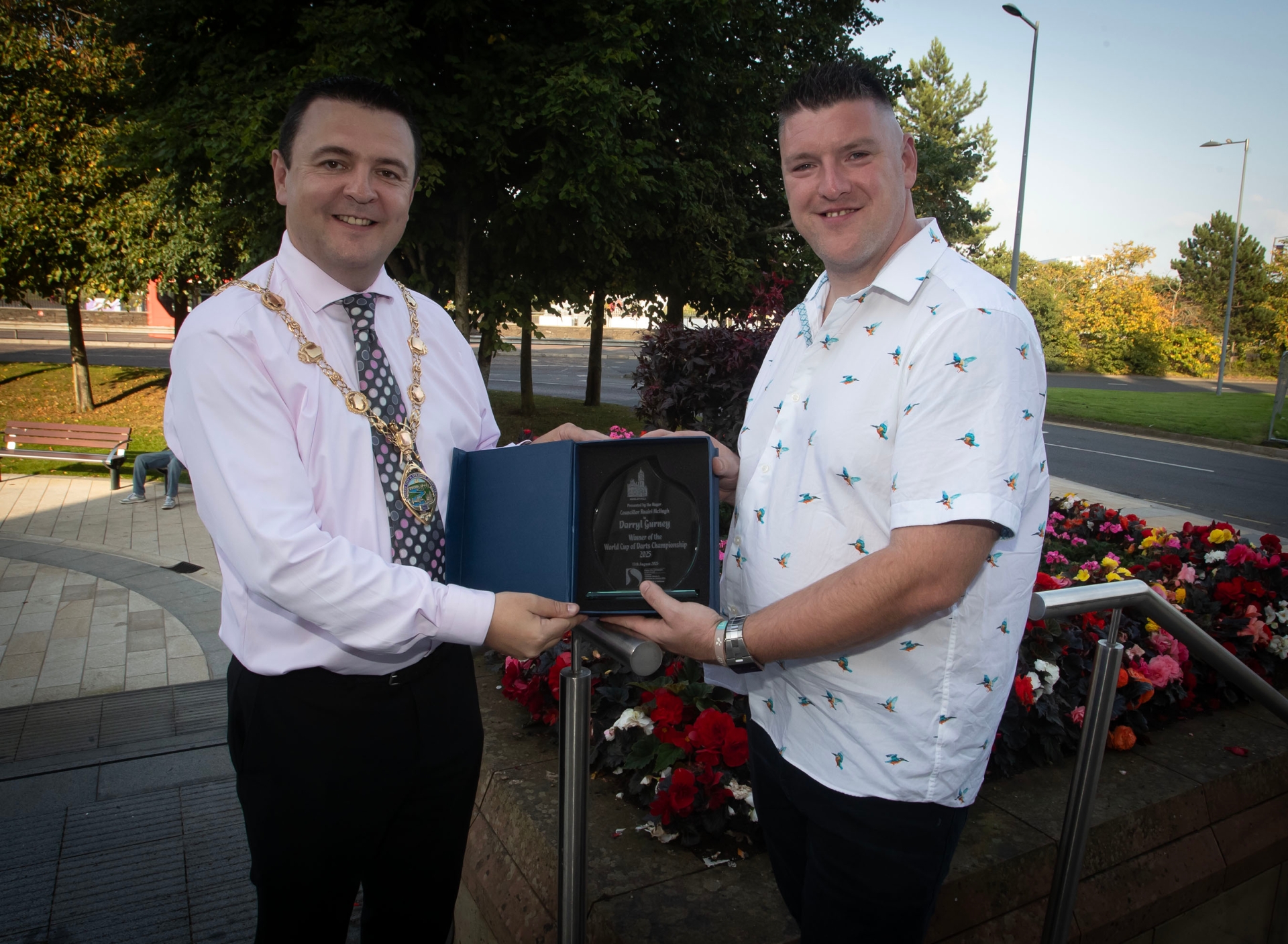 The Mayor, Ruairi McHugh making a special presentation to darts player Daryl Gurney to mark his success at the World Cup of Darts Championships 2025.