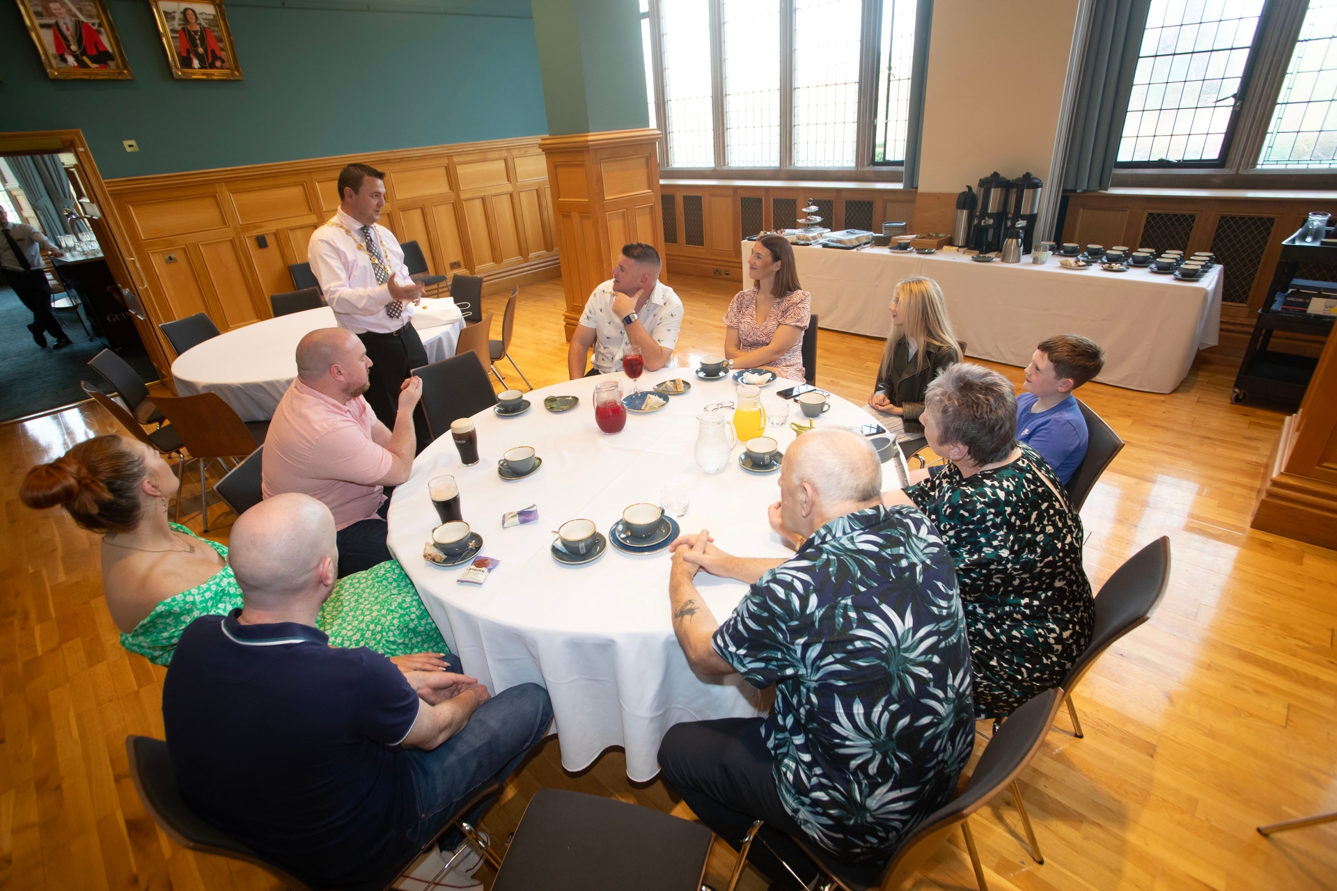 The Mayor, Ruairi McHugh congratulations darts player Daryl Gurney on his success at the World Cup of Darts Championships 2025 at a reception in the Guildhall, Derry on Wednesday evening. Included is Darren's family and friends. (Photos: Jim McCafferty Photography)