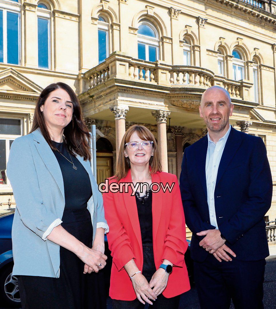 Minister for the Economy Caoimhe Archibald who met with members of the North-West Community Wealth Building Partnership at St. Columb's Hall. Included are Brian O'Neill, NW Community Wealth Building Partnership, and Annemarie Gallagher, project director, St. Columb's Hall Trust.