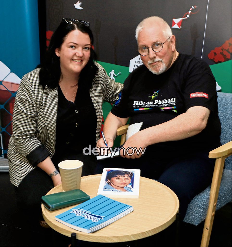 Richard McAuley co-author with Gerry Adams, signing a book for Colr. Emma McGinley at the launch of the book, "Siobhán O'Hanlon - A Sound Woman" in the Peacemakers Museum, Gasyard.