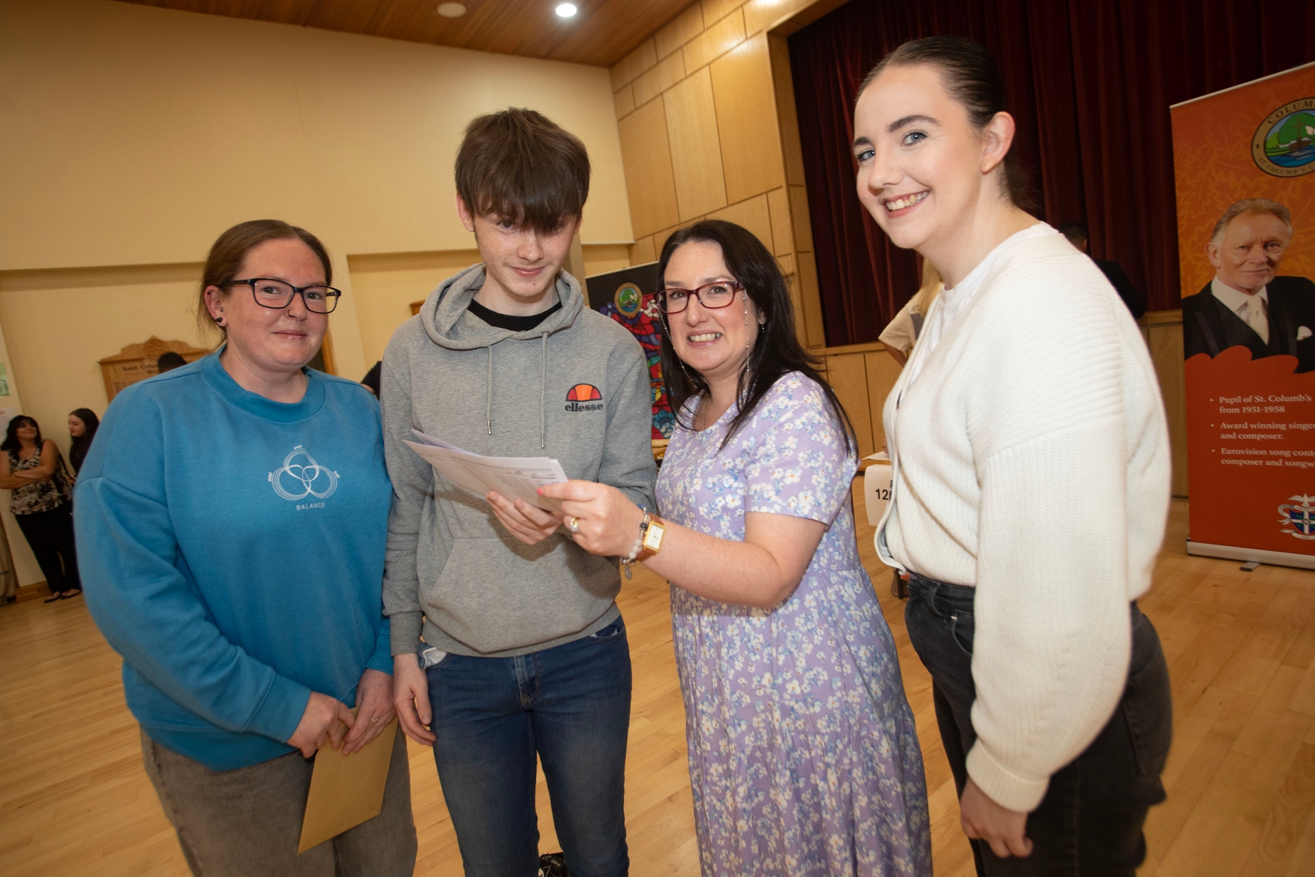 Principal Mrs. Caroline McLaughlin congratulating St. Columb's student Adamh McClintock on his results on Thursday. Included is Adamh's mum and sister. (Photos: Jim McCafferty Photography)