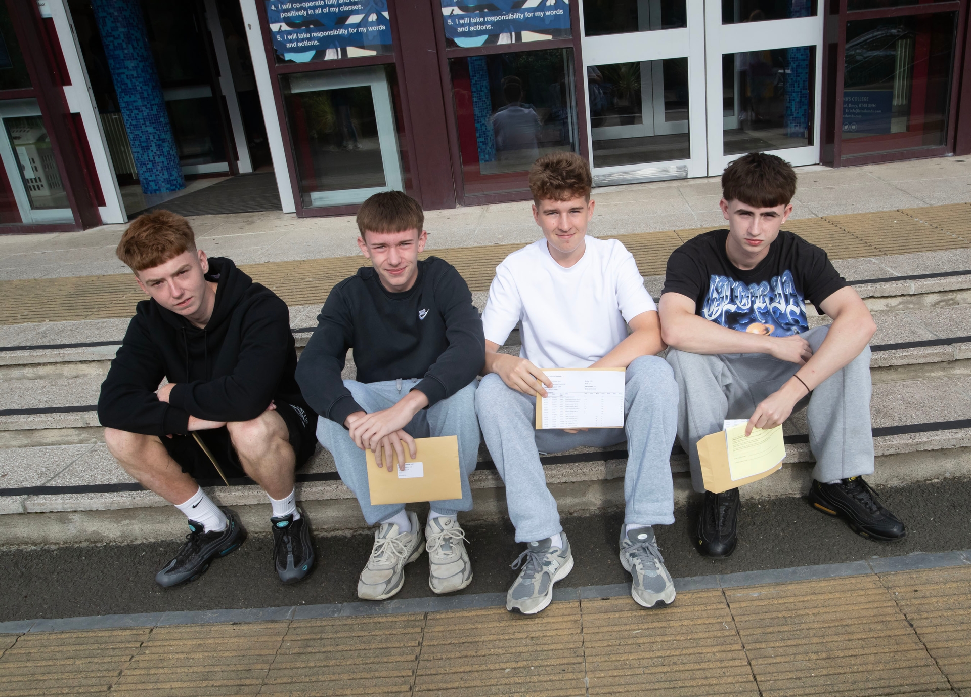 Four very relaxed St. Columb's College GCSE students relax in the steps of the school on Thursday after receiving positive results.