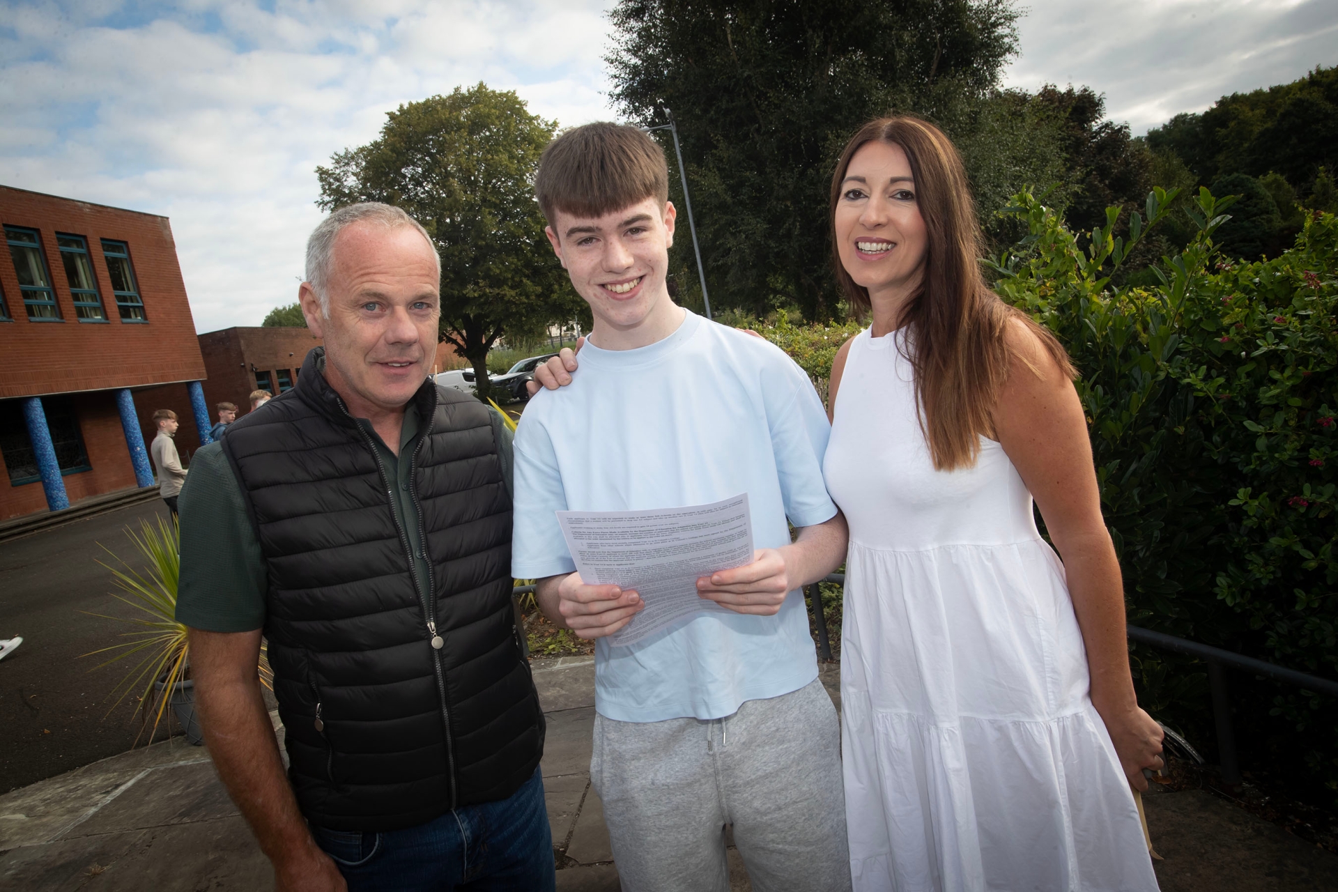 St. Columb's College GCSE student Flynn Summers pictured with his delighted parents.