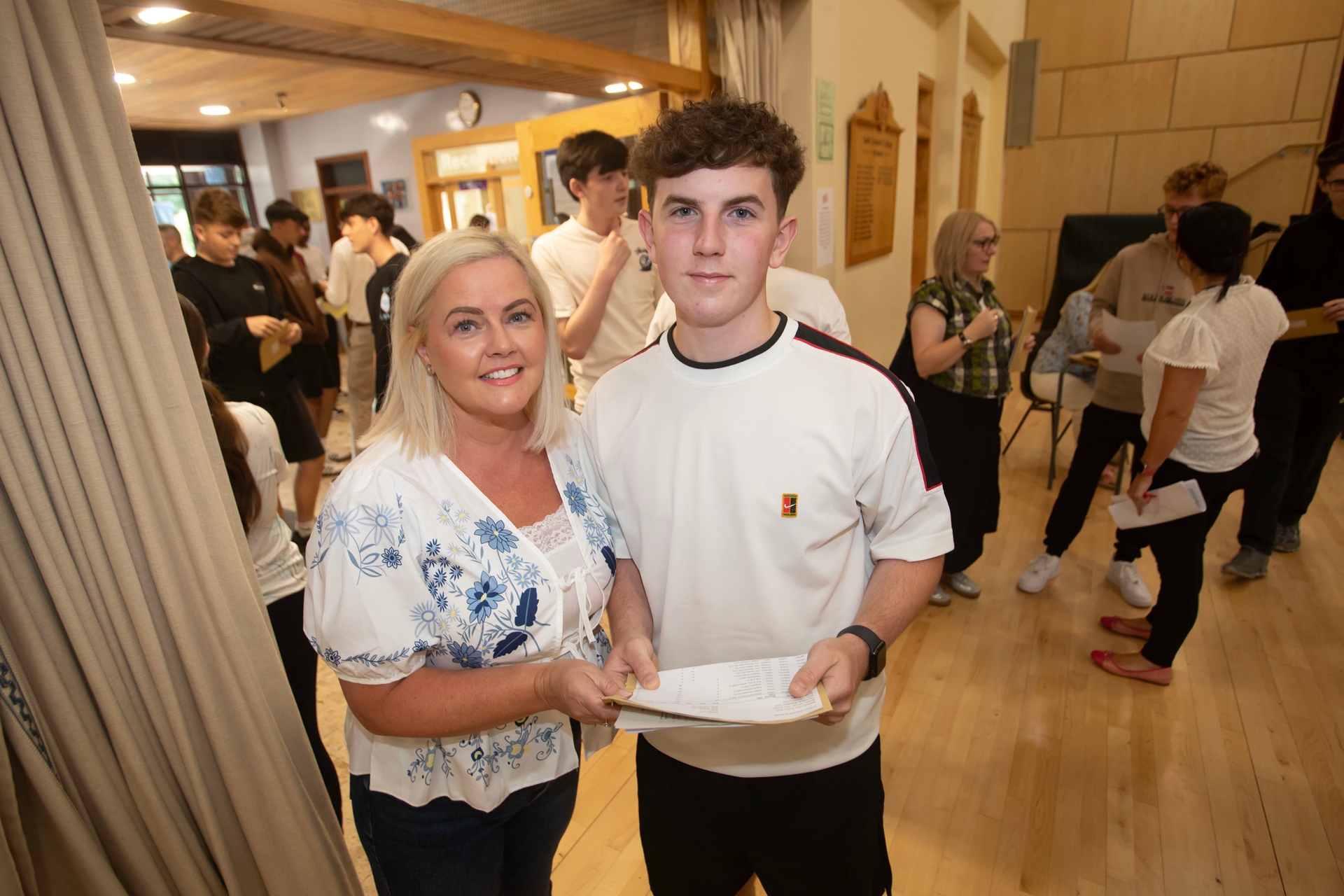 St. Columb's College GCSE student Darragh Creagh shares his results for his mum at the school on Thursday morning. (Photos: Jim McCafferty Photography)